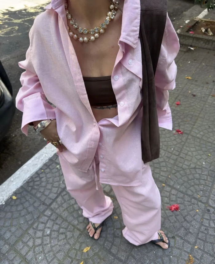 淡粉色针织衫搭配粉色衬衣,在办公室这样又防空调又时髦!