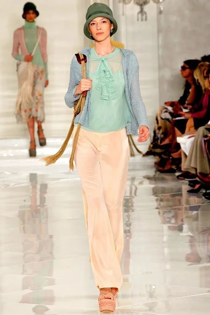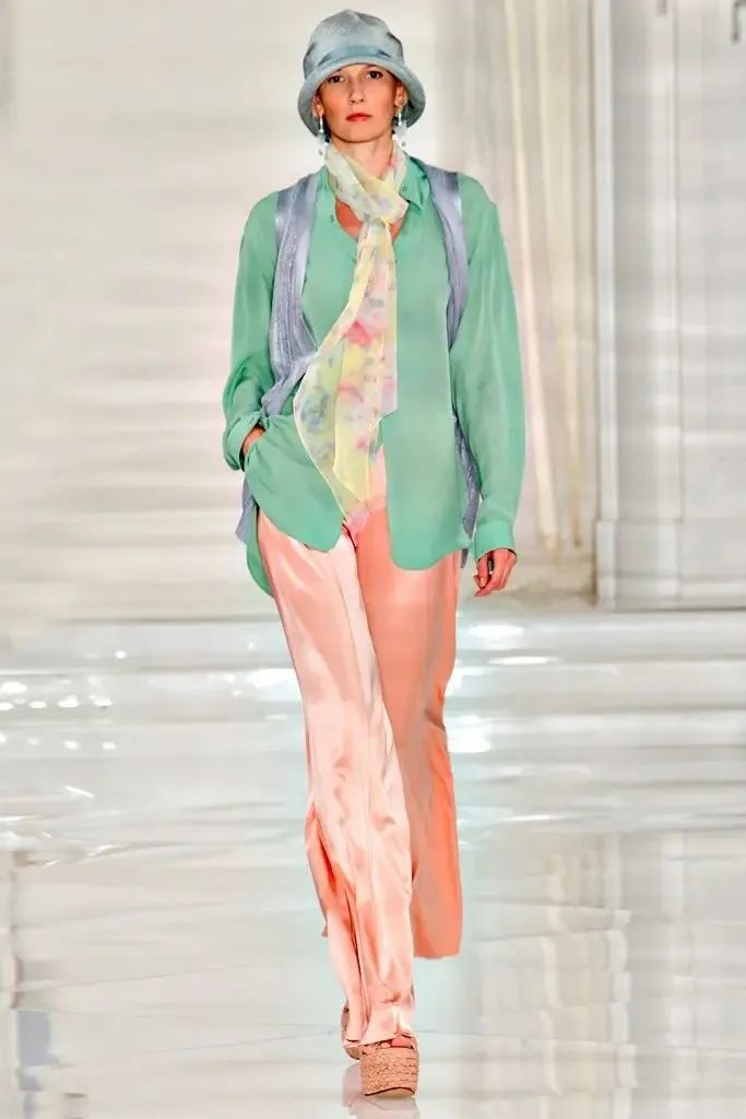 比如Ralph Lauren 2012年春夏系列里,当时看这个配色会觉得“这怎么能穿出门呀!”,但是现在再看,柔雾粉+绿刷新了彩色与“显贵”无缘的偏见印象,是呀!所谓高级感,不该被黑白棕垄断。