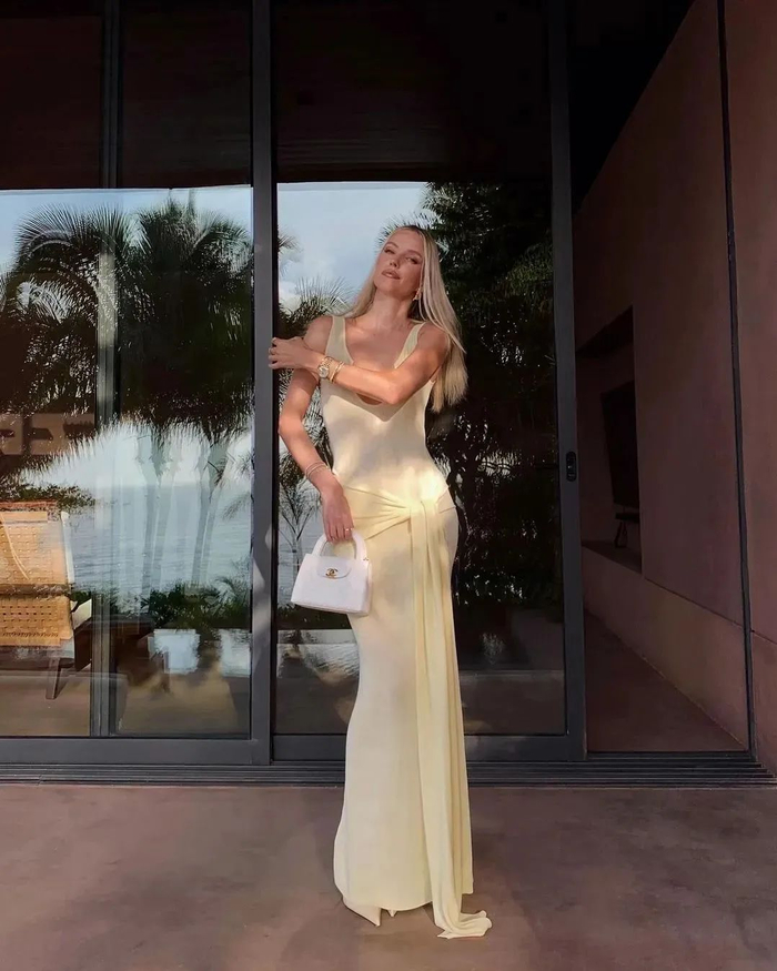 或者把黄色的亮度再调高一点点也不是不可以 ⬆️ Alaia 的蓝色连身长裙,配上一只黄色的mini Kelly,轻盈里又有着掩饰不住的生命力。