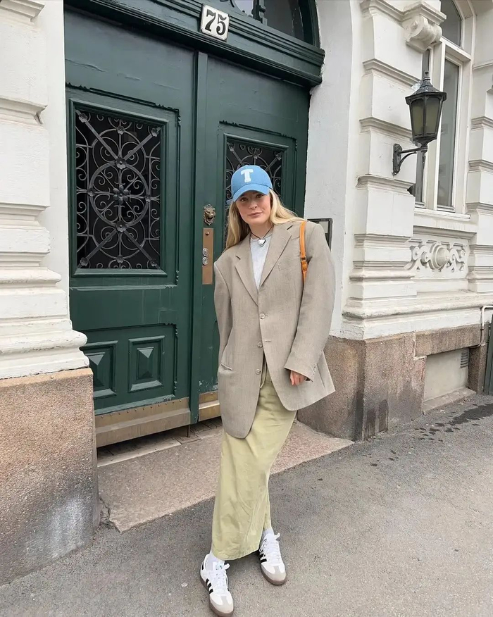 用西装与淡黄色半裙搭配就不会那么突兀啦~