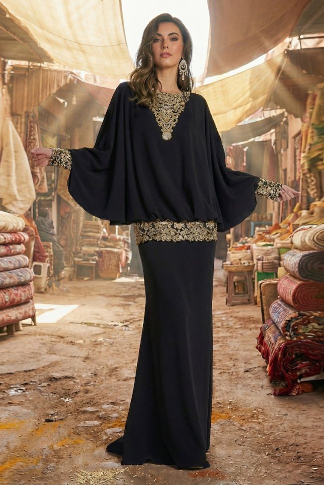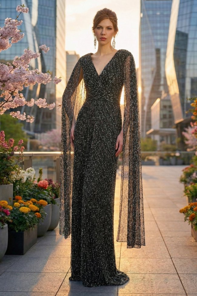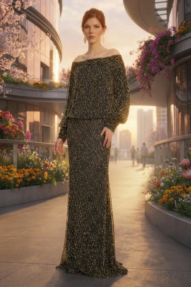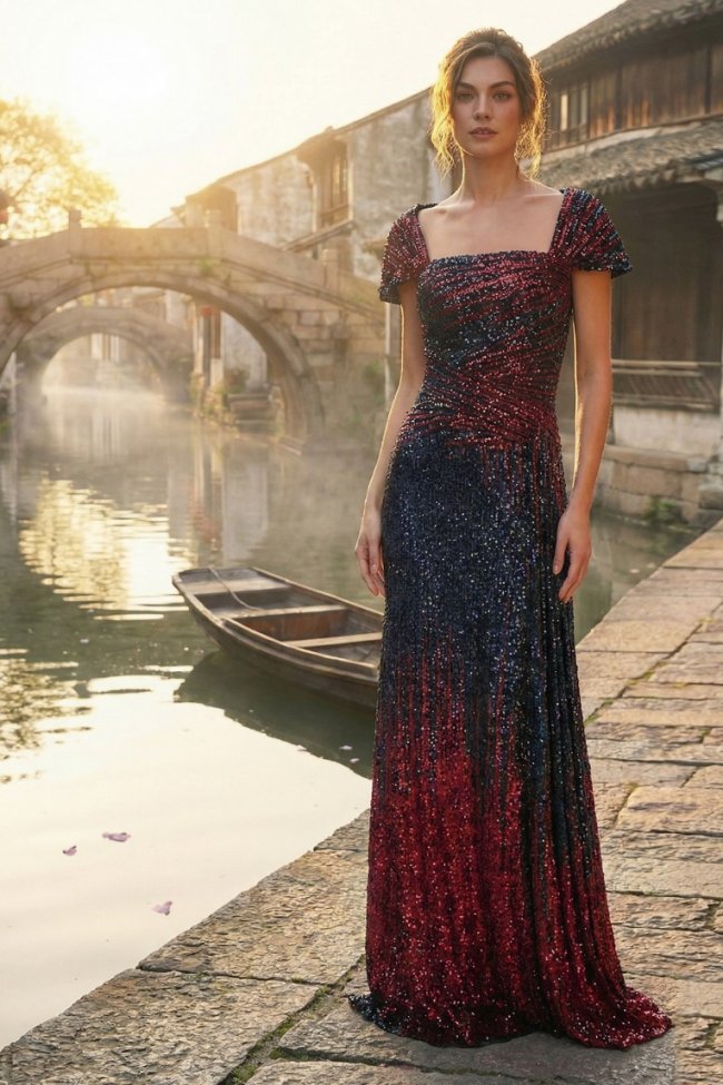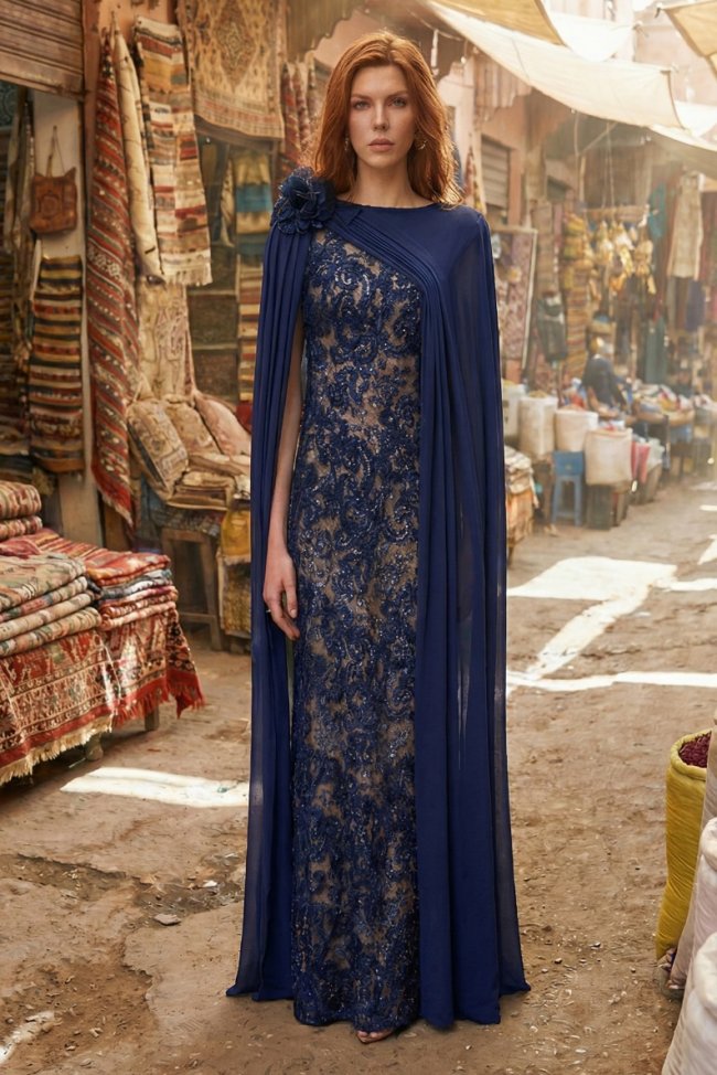 渐变亮片如夜空闪烁,肌理绉纱随身姿起伏,恰似风与大地留下的温柔轮廓。阿特拉斯刺绣薄纱勾勒出远行的轨迹,雪尼尔刺绣藏着途中遇见的古老印记,珍珠坠饰如星光轻轻垂落。一针一线,一缕光泽,都是这场游牧之旅的温柔注脚。